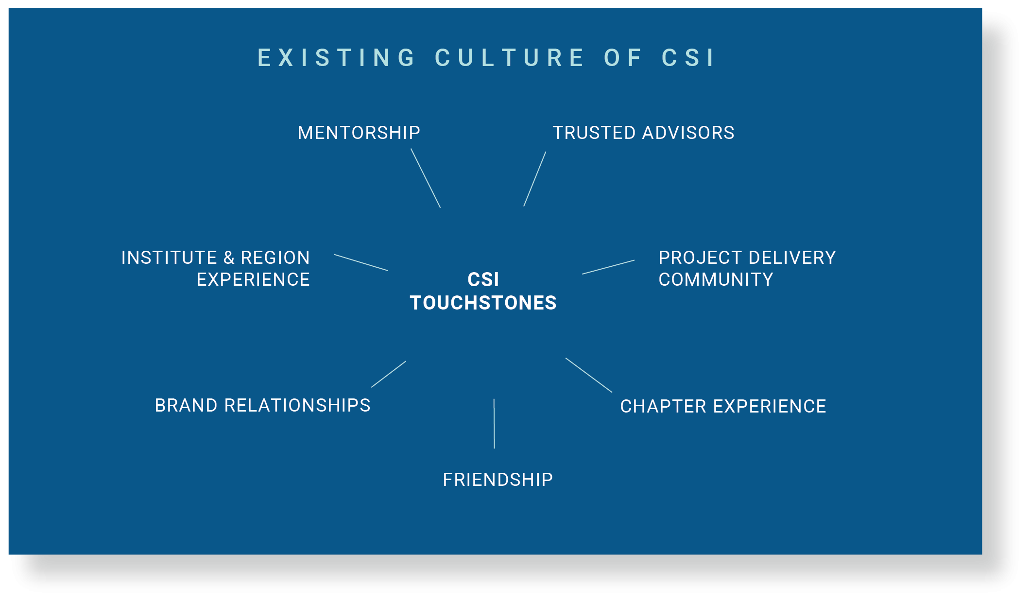 Build the new brand around the key touchstones of CSI (Trusted Advisor, Project Delivery Community, Friendship, Mentorship, Chapter, and Institute Experience) to connect every communication with the core needs of members.As part of our Brand Discovery analyzing the entire universe of CSI, its members and its competitors, Silva Brand engaged an internationally renowned anthropologist to work with us. She completed a large survey of current and prospective members in order to identify the most important features of CSI’s product and service offering.